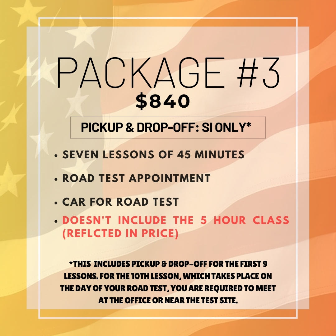 Note: When comparing prices with other driving schools on Staten Island, you’ll find the Pick-Up option to be extremely affordable. Many schools advertise “free pick-up” but do not include the road test vehicle. Once those services are added, their total cost is often higher.